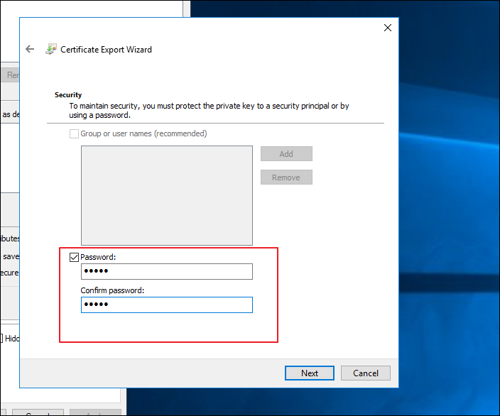- 소유주 계정 선택 - Back up Keys - Next - Enable certificate privacy 체크 - Next