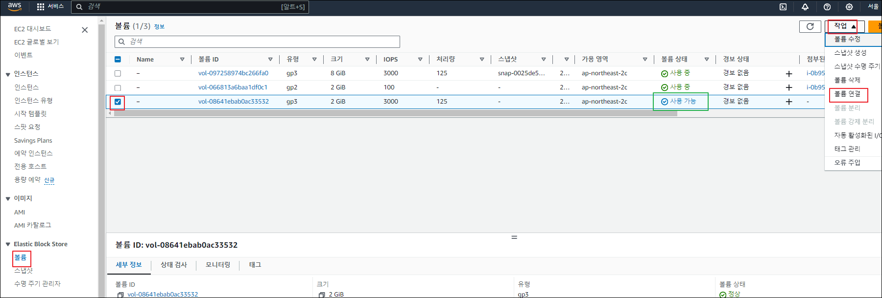 - 좌측 메뉴 'Elastic Block Store' - '볼륨' - 연결한 EBS 선택(사용 가능 상태) - '작업' - '볼륨 연결'