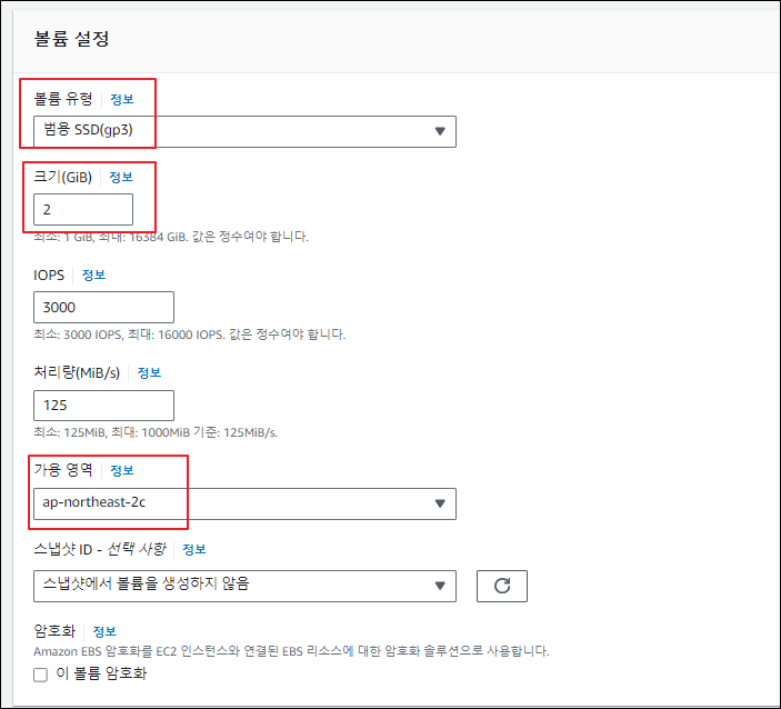 * 볼륨 유형: 범용 SSD 볼륨은 gp2와 gp3가 있으며 gp3가 기본 옵션