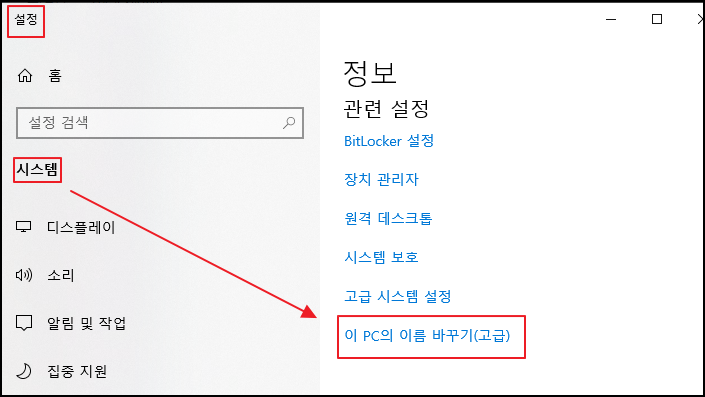 * 방법: 검색 "설정" - 시스템 - 이 PC의 이름 바꾸기