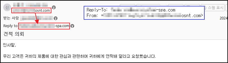* 아래 사진은 '**@**osnt.com'에서 온 메일이지만 답장은 '**@**-spa.com'이 받도록 되어 있다.