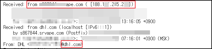 * 아래 사진은 발신자 메일이 dhl.com 도메인이지만 발송 호스트(서버)는 dhl와 연관이 없는 서버로 확인된다.