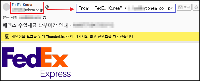 * 아래 사진은 FedEx-Korea를 사칭한 피싱 메일로 발신자 메일 주소는 '**tohem.co.jp'로 확인된다.