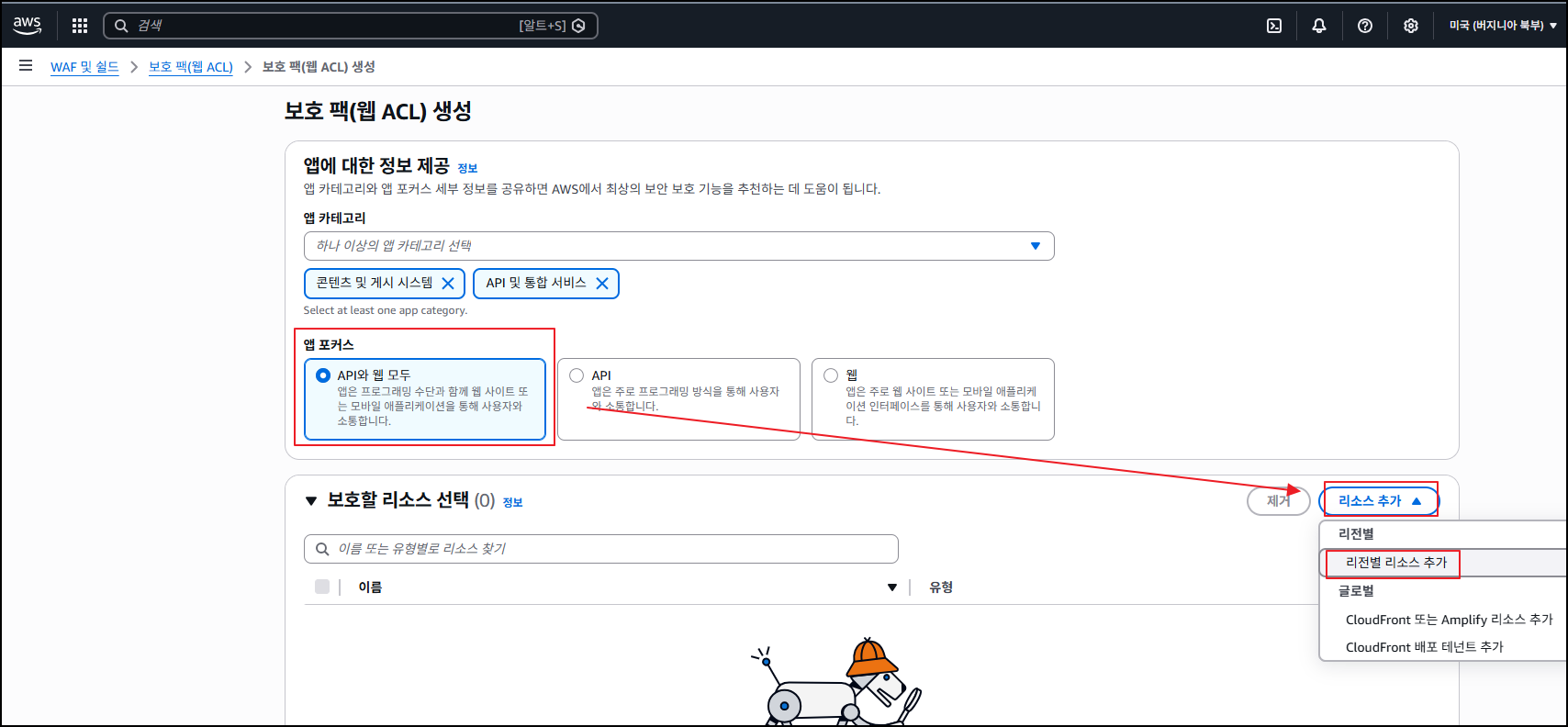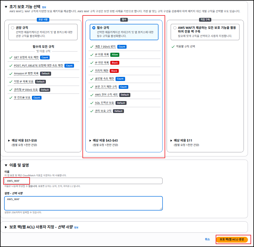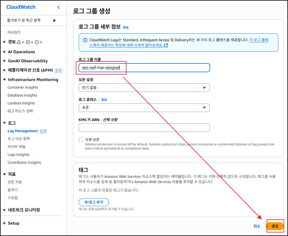 * 로그 그룹을 새로 생성할 때는 이름이 'aws-waf-logs-' 로 시작해야 한다