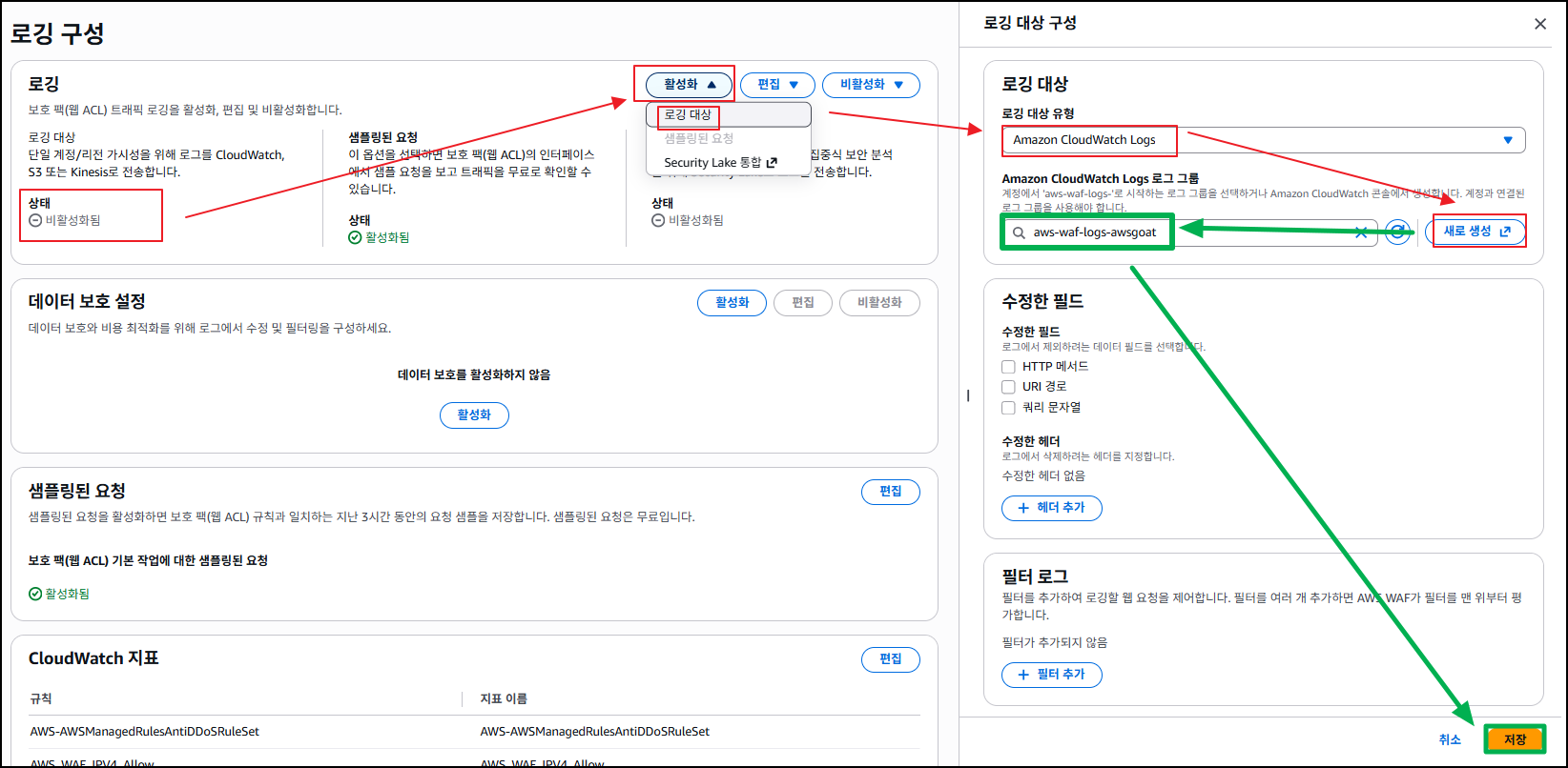 - 활성화 - 로깅 대상 - Amazon CloudWatch Logs - '새로 생성' -> 생성한 로그 그룹 명 입력 -> 저장