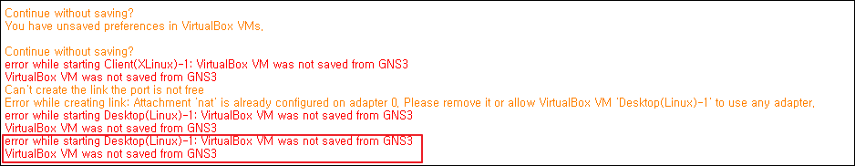 [구축] ERROR 해결/VirtualBox VM was not saved from GNS3