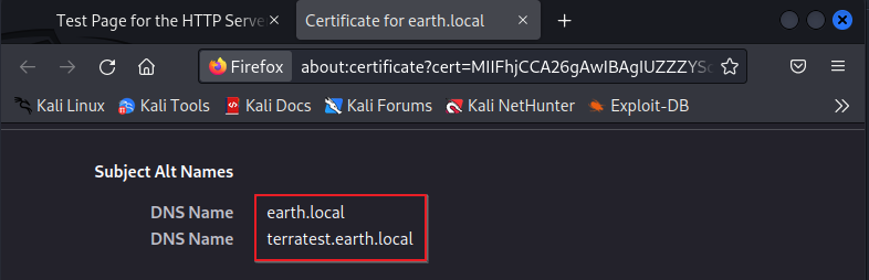 - SSL 인증서의 DNS 정보에서 earth.local 및 terratest.earth.local 확인됨