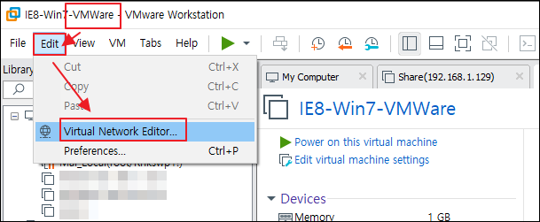- 먼저 VMware NAT Setting은 VMware 메뉴 - Edit - Virtual Network Editor 순으로 이동
