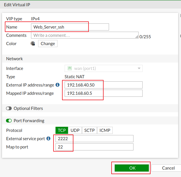 - 포트포워딩을 식별할 수 있는 이름, 방화벽 WAN IP와 매핑할 IP(웹 서버), 방화벽 WAN PORT와 매핑할 PORT 설정