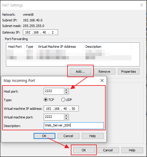 ==> 그림의 경우 localhost:2222 접근 시, 가상 머신 192.168.40.50:2222 port로 접근하도록 설정