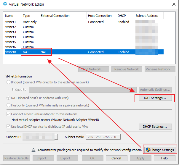 - Editor가 열리면 'Change Settings - 원하는 네트워크 선택 - NAT Settings' 순으로 클릭