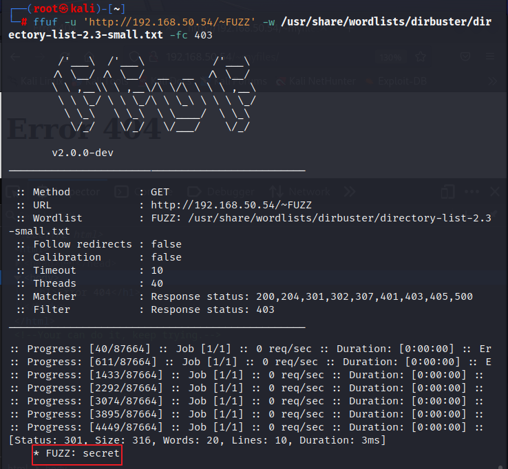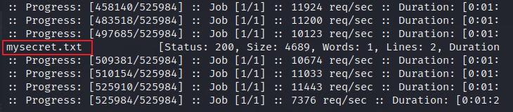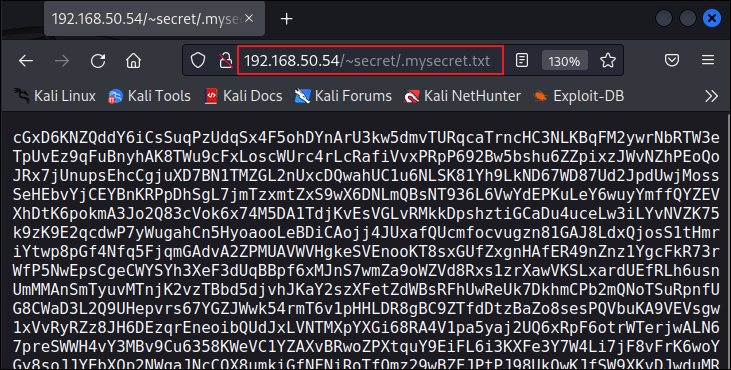 * /~secret/ 디렉터리 내 이것 저것 스캔 중 SSH 개인키로 보이는 .mysecret.txt 파일 확인