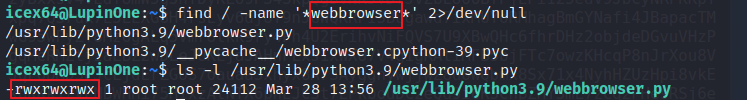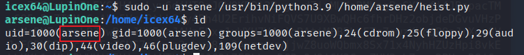 * icex64 계정은 arsene 계정 권한으로 패스워드 없이 /usr/bin/python3.9, /home/arsene/heist.py 사용 가능