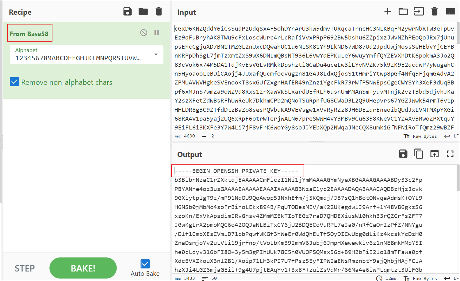 - cyberchef를 통해 확인해본 결과, base58 디코딩을 진행하면 SSH 개인키 양식 등장