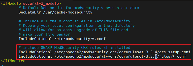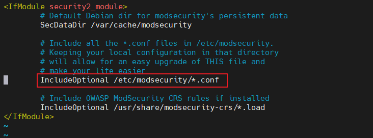 - /etc/apache2/mods-enabled/security2.conf 파일을 확인하면 /etc/modsecurity/ 내 .conf 파일을 참고하는 행 존재