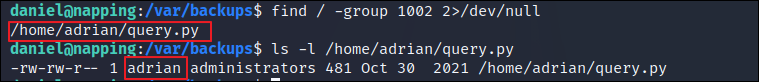 - query.py 파일에 대해 administrators 그룹은 쓰기 권한 존재하여 코드 삽입