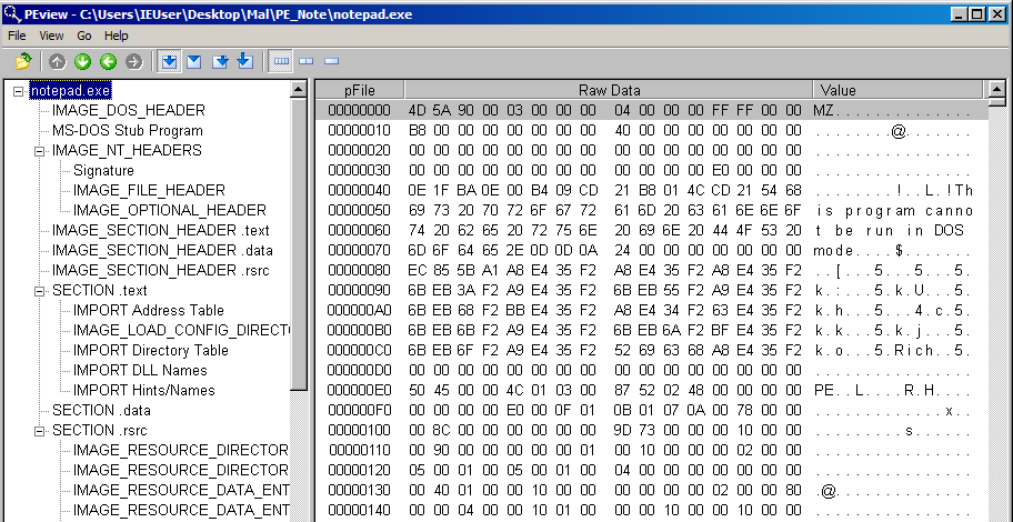 IMAGE_DOS_HEADER의 크기는 40으로 Rawdata에서 00000000 ~ 0000003F까지를 나타냄
