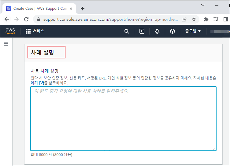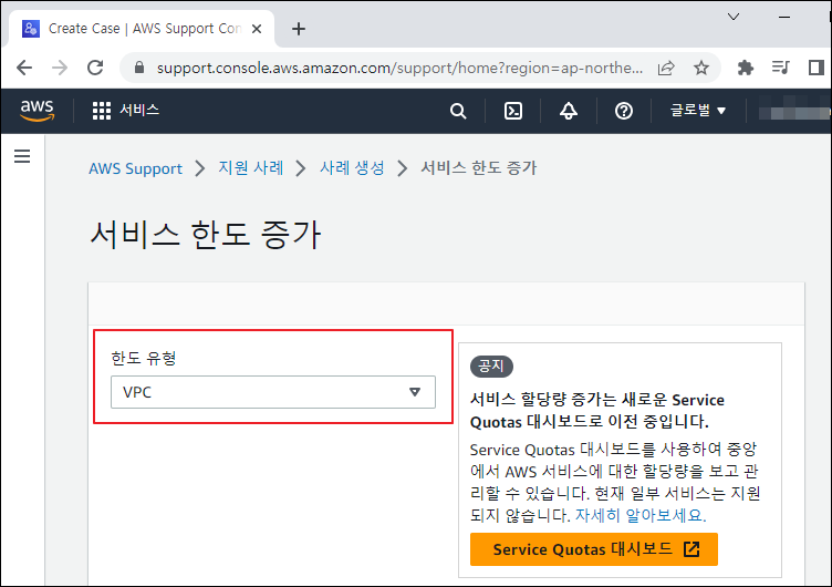 - 요청에서 내용 적절하게 선택 (Region: Seoul, 한도: VPCs per Region, 새 한도 값: [필요량 선택])