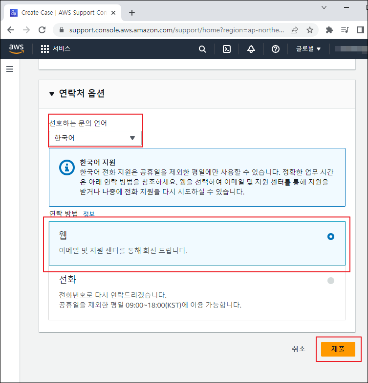 - 연락처 옵션 적절히 선택 (언어: 한국어, 연락 방법: 웹)